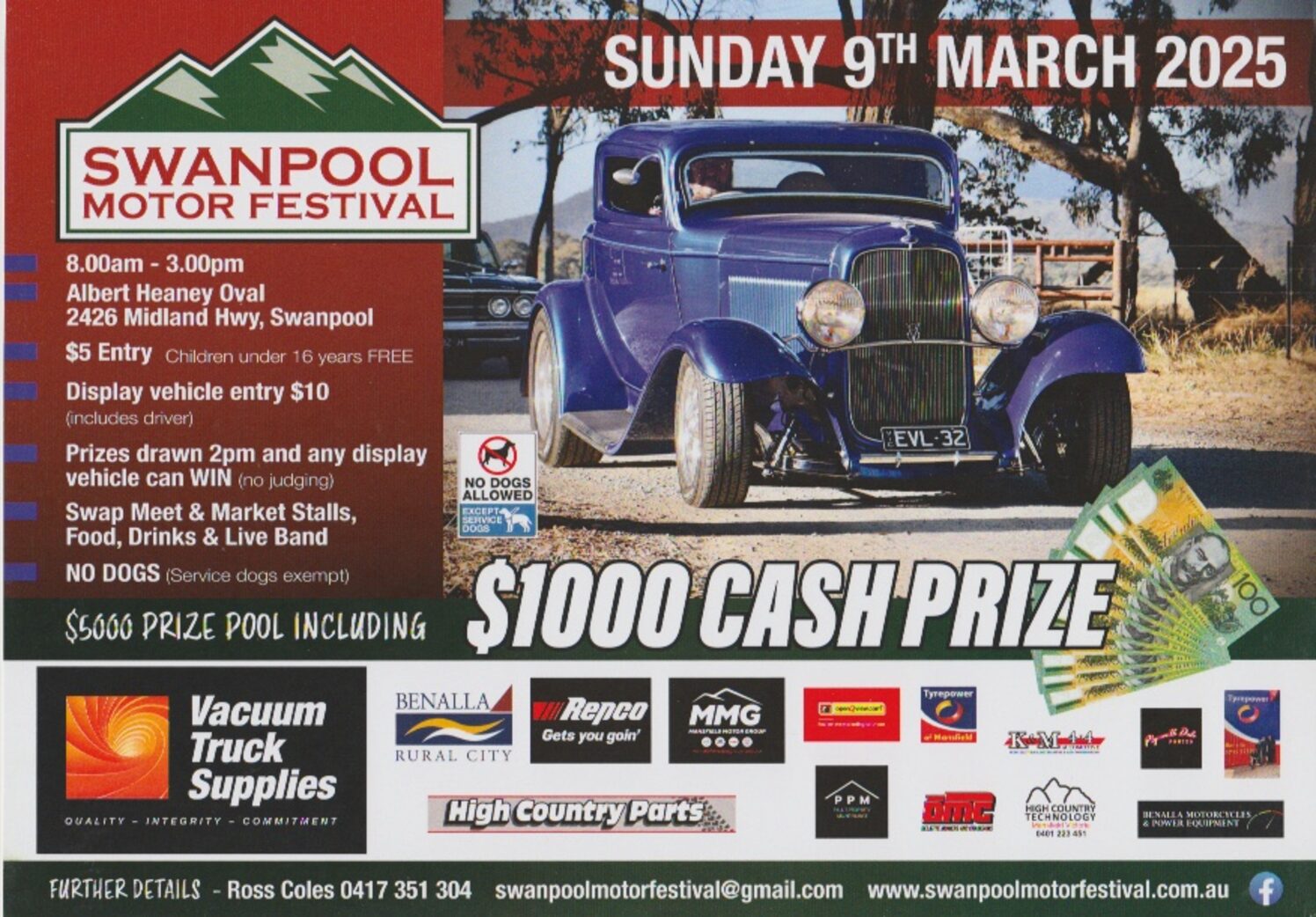 There is a live band playing all day along with swap meet and market stalls, food vans and drinks. All proceeds go towards the maintenance and upkeep of the Albert Heaney Oval. Further details on their website: www.swanpoolmotorfestival.com.au or facebook or our email: swanpoolmotorfestival@gmail.com